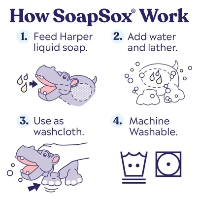 SoapSox® is de volgende generatie washandjes voor kinderen. Een verzameling schattige karakters die baden leuk maken voor kinderen en gemakkelijker voor ouders. Wat SoapSox speciaal maakt, is de ‘feed me’-functie waarmee kinderen vloeibare zeep aan Harper the Hippo kunnen ‘voeden’ en er een schuim van kunnen maken. Dankzij de extra vingerzakken is Harper gemakkelijk vast te houden en wordt de hygiëne tijdens het spelen vergemakkelijkt.