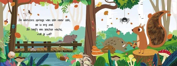 Welke dieren leven er in het bos? In dit boekje leer je ze kennen, maar kun je ze ook aaien! Voel maar eens aan de vacht van het hert, de stekels van een egel of de staart van de eekhoorn. Stevig boekje voorzien van mooie illustraties en stofjes en lieve rijmpjes om voor te lezen maar waarmee je kindje ook zelf kan spelen en ontdekken.