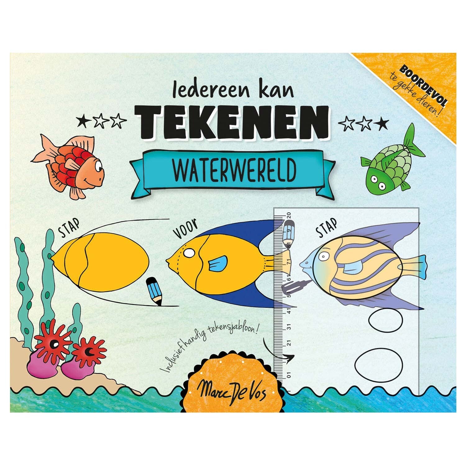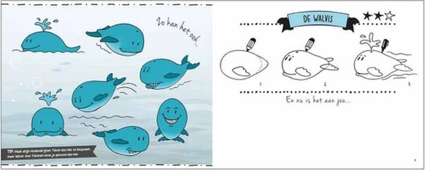 Leer dieren tekenen in drie stappen! In drie eenvoudige stappen wordt er uitgelegd hoe je een dier kunt tekenen. Achterin het boek vind je een sjabloon met vijf eivormige gaten. Deze vormen zijn elke keer de basis voor het tekenen van een dier. Het papier in het boek is stevig en dik genoeg om op te tekenen, maar je kunt natuurlijk ook je eigen tekenblok gebruiken. Als het vervolgens gelukt is om het dier te tekenen, geeft het boek ook opties voor een andere houding van het dier om te proberen. De sterren bovenaan de tekening geven aan of het niveau 1, 2 of 3 sterren is. Start met tekenen en maak je eigen waterwereld!
