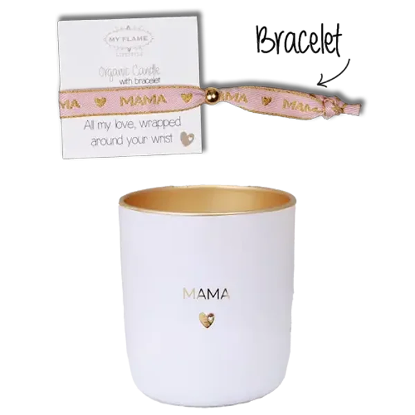 Een heerlijke geurkaars gemaakt van biologische sojawas. Deze kaars heeft de geur Fresh Cotton en brandt ca. 50 uur. Deze sojakaars wordt gesierd met de tekst 'Mama'. Een leuk detail aan deze kaars is dat het inclusief armbandje is met mama quote. Superleuk 2-in-1 cadeau voor Moederdag, verjaardag of zomaar voor de beste, liefste bonus moeder van de heeele wereld.