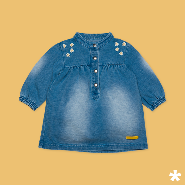 Jog denim jurk met geborduurde bloemetjes van BESS, in de kleur stone wash.