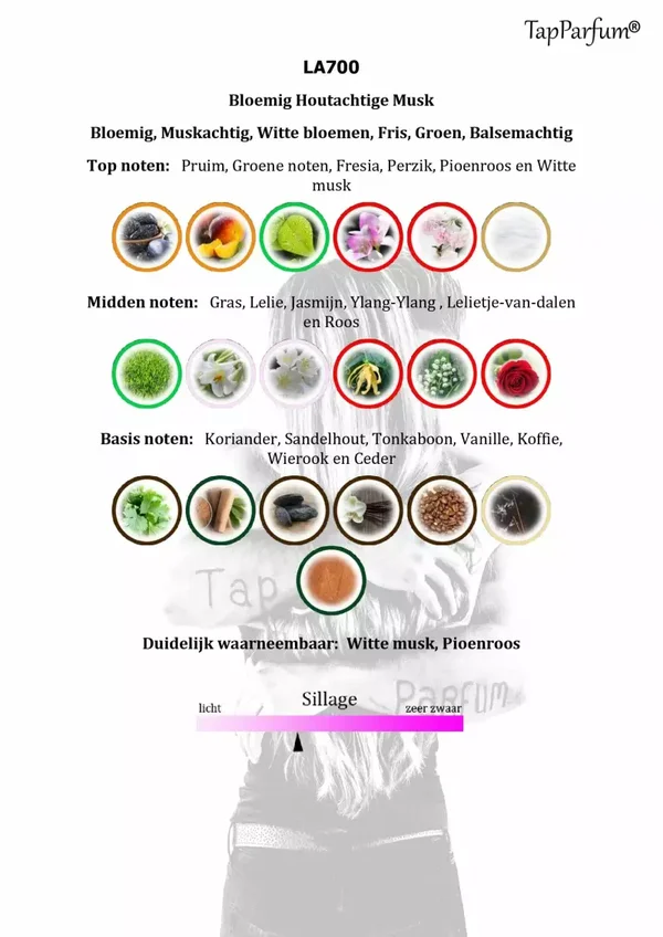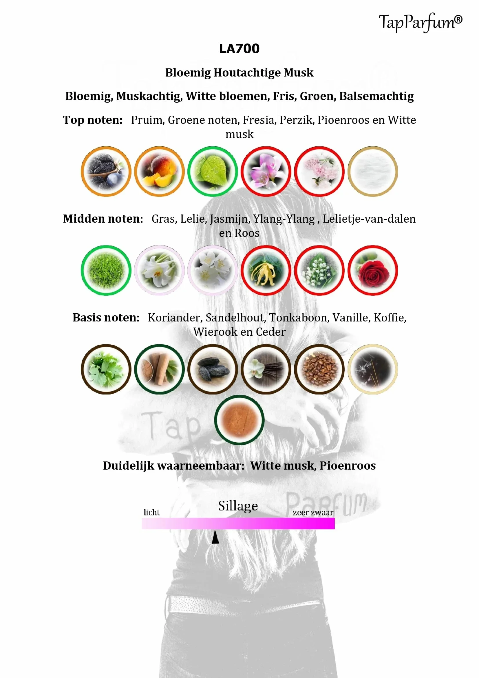 LA700 is een dames parfum die in de Bloemig Houtachtig Musk categorie valt met het hoofdakkoord muskachtig. De duidelijkst waarneembare geurnoten zijn witte musk, pioenroos en . Het sillage van dit dames parfum wordt omschreven als midden.